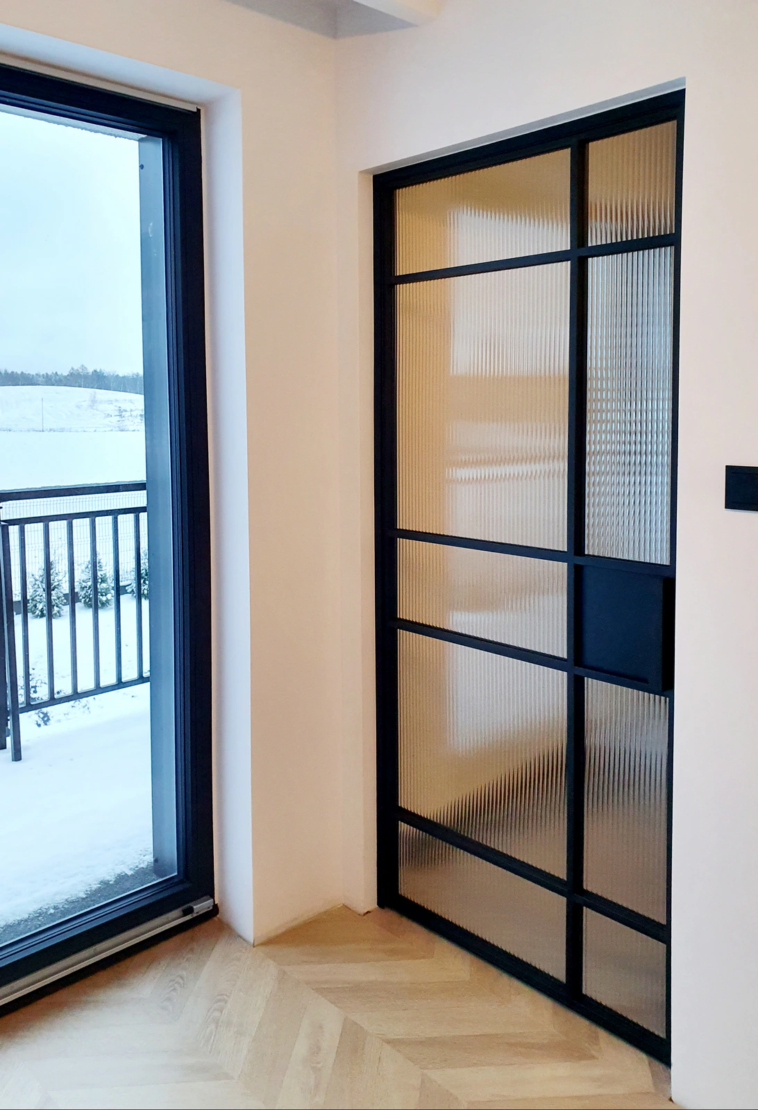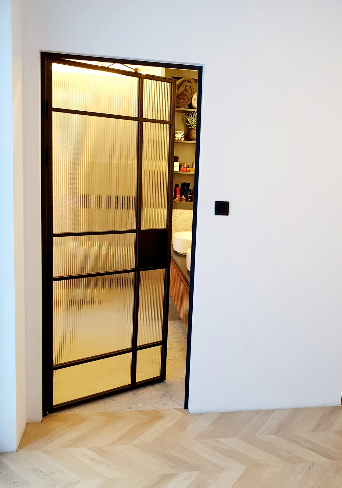Z wnętrza łazienki widać, jak świetnie czerń ramy kontrastuje z beżowymi/szarymi płytkami oraz drewnianą szafką pod umywalkę. Szkło ryflowane daje ciekawy efekt świetlny – światło wpadające z sypialni do łazienki i odwrotnie, układa się w pionowe prążki. Drzwi loftowe do garderoby te pełnią funkcję „witryny”. Zamiast całkowicie ją zamykać, eksponują ją lekko, co optycznie powiększa sypialnię.