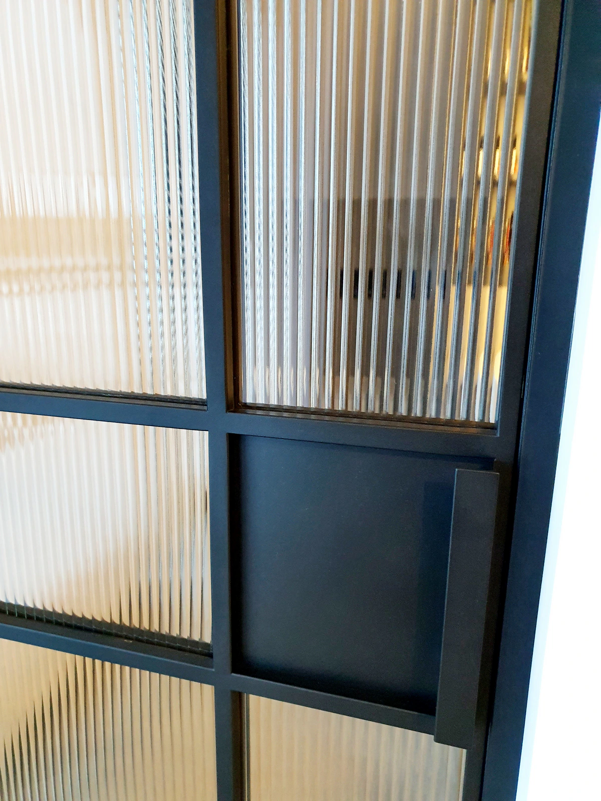 Zastosowano tu szkło ryflowane Flutes (ornamentowe/prążkowane). To kluczowy element funkcjonalny – szkło to przepuszcza światło, ale skutecznie rozmywa obraz.