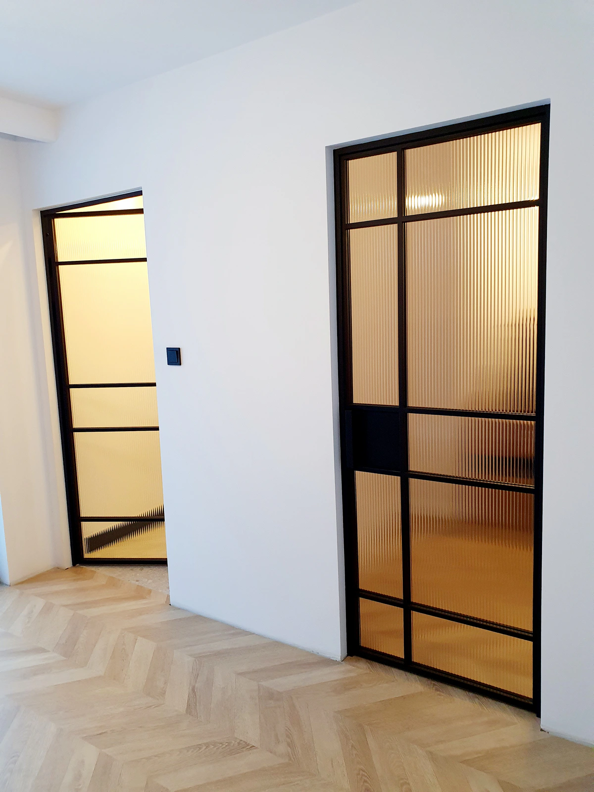 Realizacja w domu prywatnym w Kartuzach, to drzwi loftowe w systemie przylgowym – tradycyjnie otwieranym. Zostały zaprojektowane jako spójny komplet dla strefy „master bedroom” – sypialni połączonej z łazienką i garderobą.