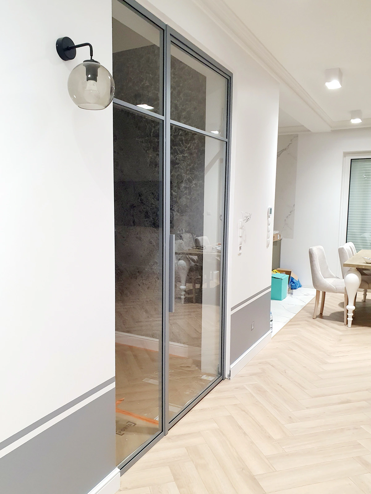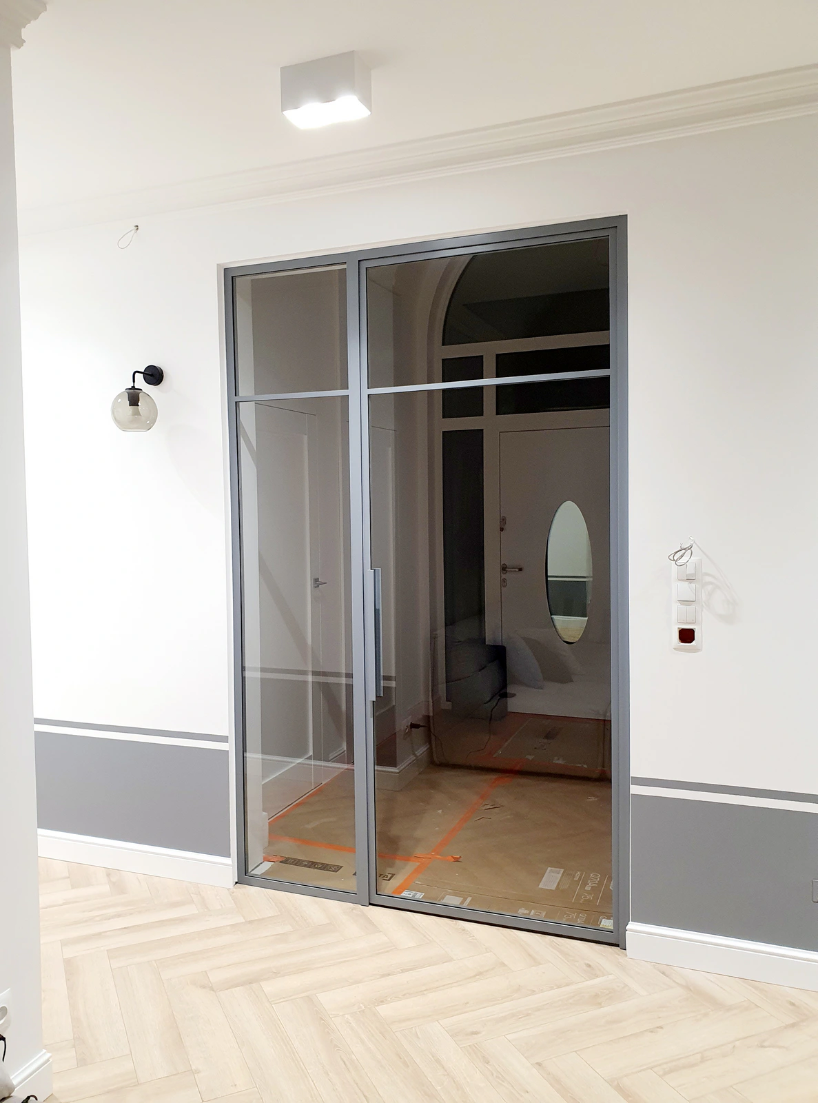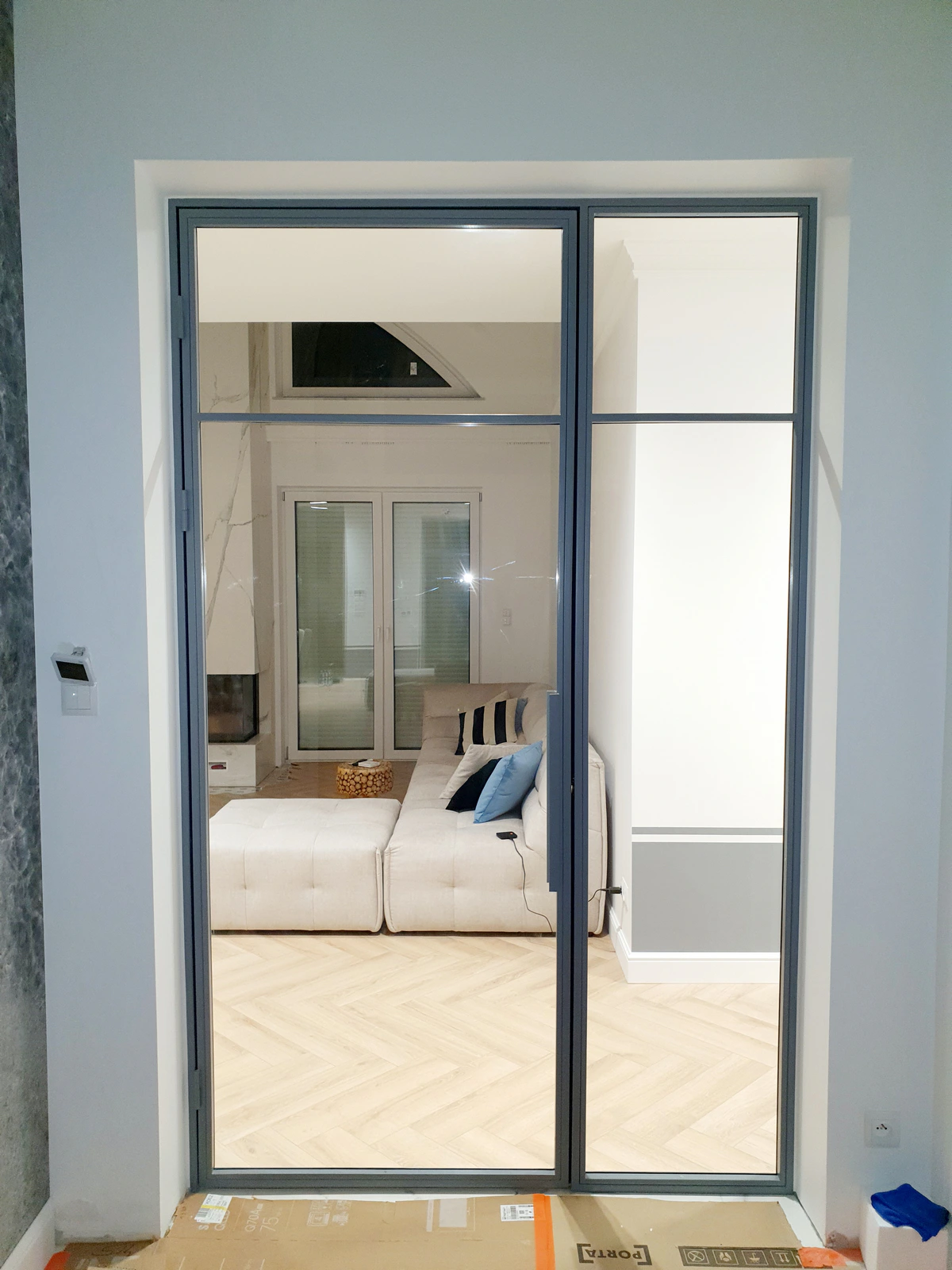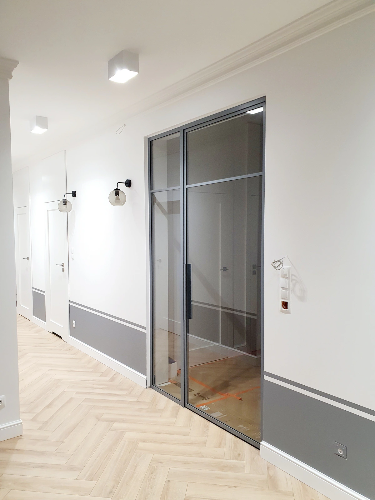Zastosowaliśmy tu konstrukcję jednoskrzydłowych drzwi na zawiasach z bocznym panelem stałym. Całość tworzy eleganckie przeszklenie loftowe. Stalowa rama została wykonana ze smukłych profili stalowych. Następnie poddano ją procesowi malowania proszkowego na niestandardowy, jasnoszary odcień o matowym wykończeniu. Podział szprosów jest asymetryczny. Pojedyncza pozioma linia dzieli tafle szkła w obu elementach na tej samej wysokości. Wypełnienie stanowi bezpieczne szkło VSG w wariancie transparentnym. Pozwala to na swobodny przepływ światła i tworzy subtelne refleksy, optycznie powiększając wnętrze.