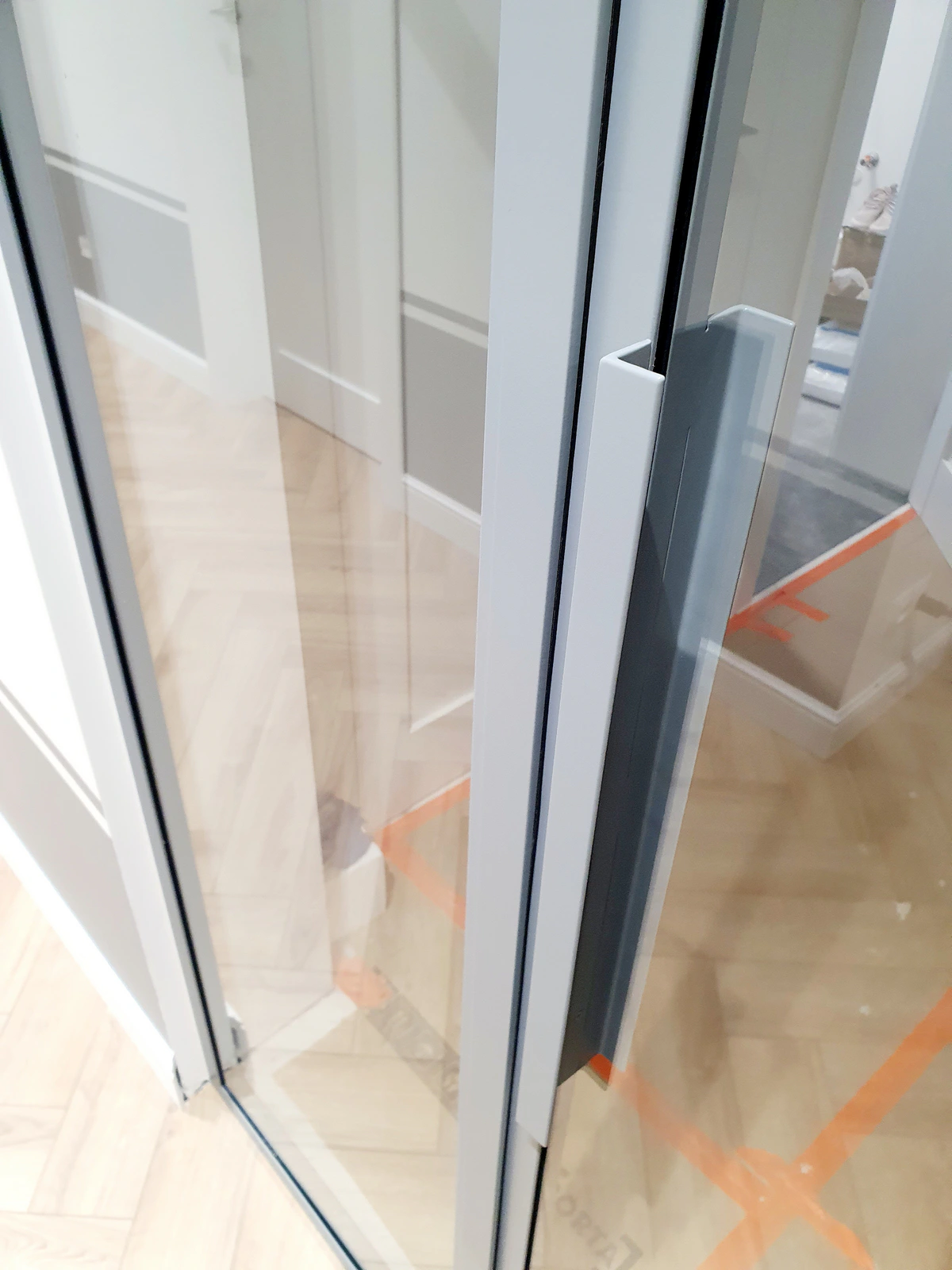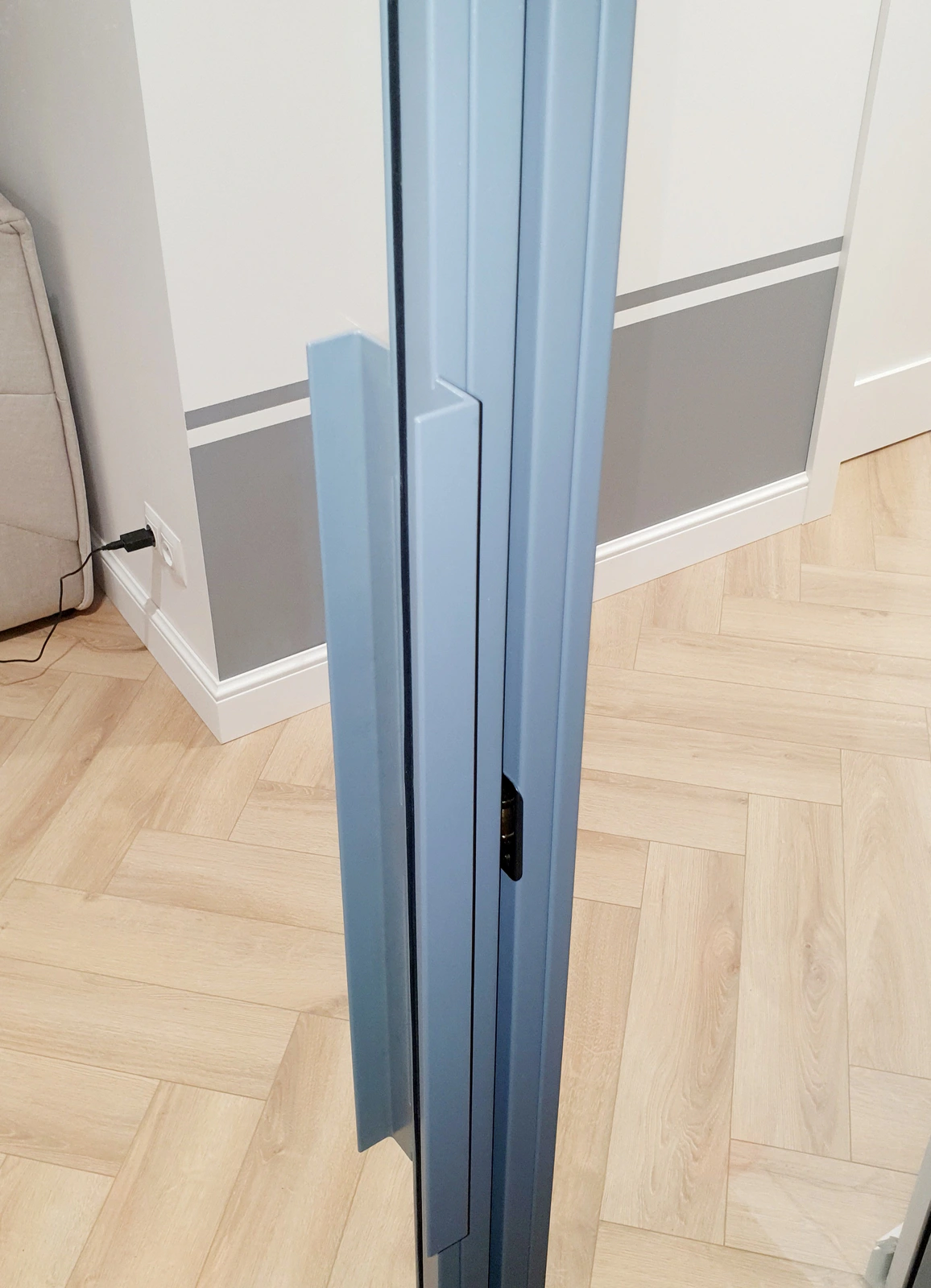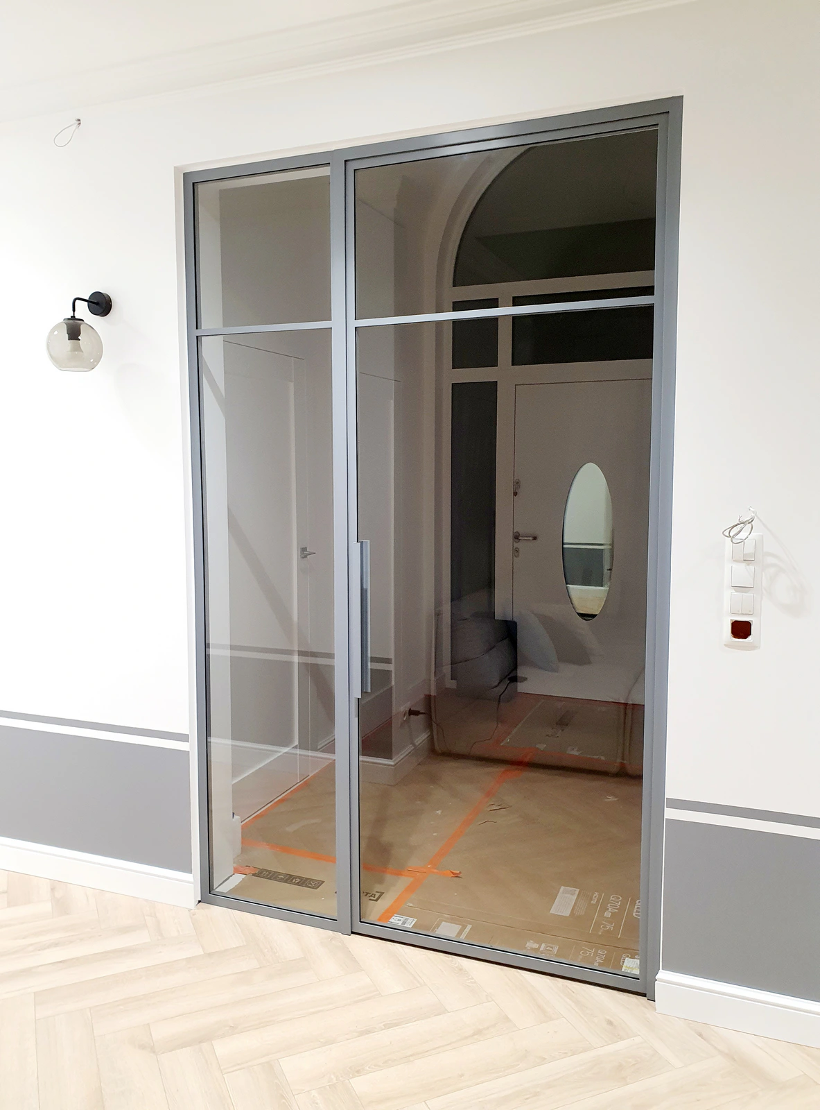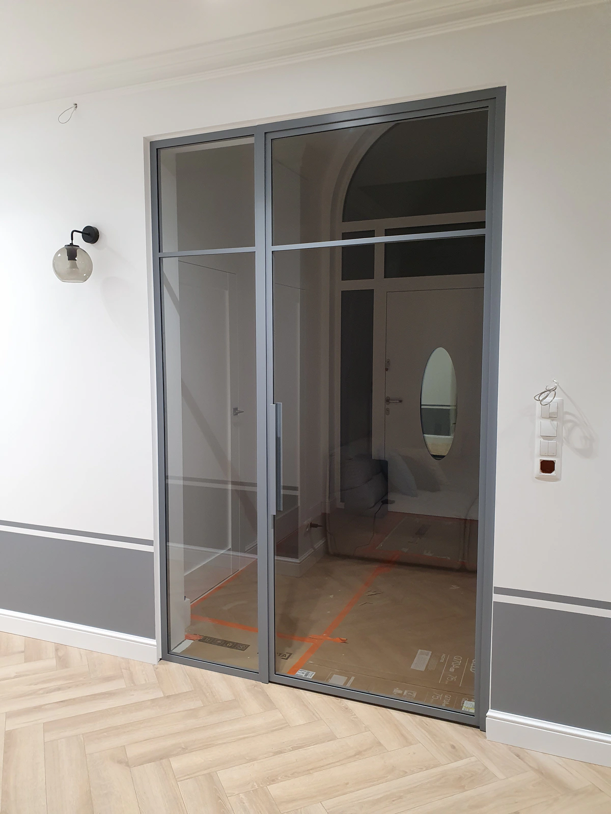 Zastosowaliśmy tu konstrukcję jednoskrzydłowych drzwi na zawiasach z bocznym panelem stałym. Całość tworzy eleganckie przeszklenie loftowe. Stalowa rama została wykonana ze smukłych profili stalowych. Następnie poddano ją procesowi malowania proszkowego na niestandardowy, jasnoszary odcień o matowym wykończeniu. Podział szprosów jest asymetryczny. Pojedyncza pozioma linia dzieli tafle szkła w obu elementach na tej samej wysokości. Wypełnienie stanowi bezpieczne szkło VSG w wariancie transparentnym. Pozwala to na swobodny przepływ światła i tworzy subtelne refleksy, optycznie powiększając wnętrze.